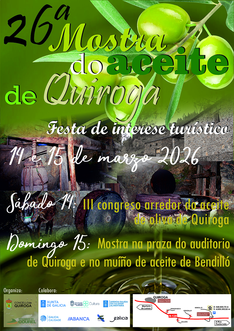 Programa da XXVI Mostra do aceite de Quiroga CARNAVAL QUIROGA 2026 MERCADO DE NAVIDAD QUIROGA 2025 PROGRAMACIÓN NAVIDAD EN QUIROGA 25-26 HOJA INSCRIPCIÓN QUIMEDO 6: 25 DE OCTUBRE DE 2025 PROGRAMA FIESTAS DE VERANO QUIROGA 2025 XXXIV Muestra de la miel de Quiroga 2025 II DESCUBRIR QUIROGA HORARIOS DE VERÁNO MUSEOS DE QUIROGA FERIA DEL VINO DE QUIROGA: DESDE EL 11 DE NOVIEMBRE DE 1980 CATA DE VINOS ESPUMOSOS PROGRAMA XLIII FERIA DEL VINO DE QUIROGA 2025 13ª Val de Quiroga de tapas. Jornada formativa para pilotos de parapente. 25ª MUESTRA DEL ACEITE DE QUIROGA. PROGRAMA