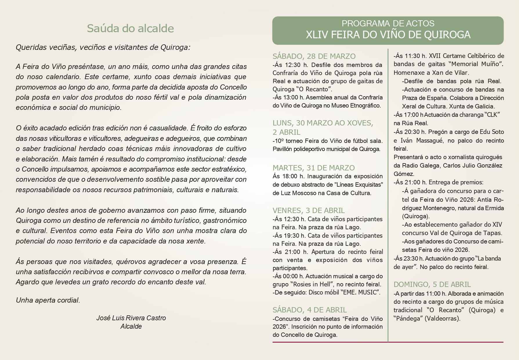Ayuntamiento de Quiroga > Boletín de Noticias > PROGRAMA DE MANO DE LA XLIV FEIRA DO VIÑO DE QUIROGA 2026